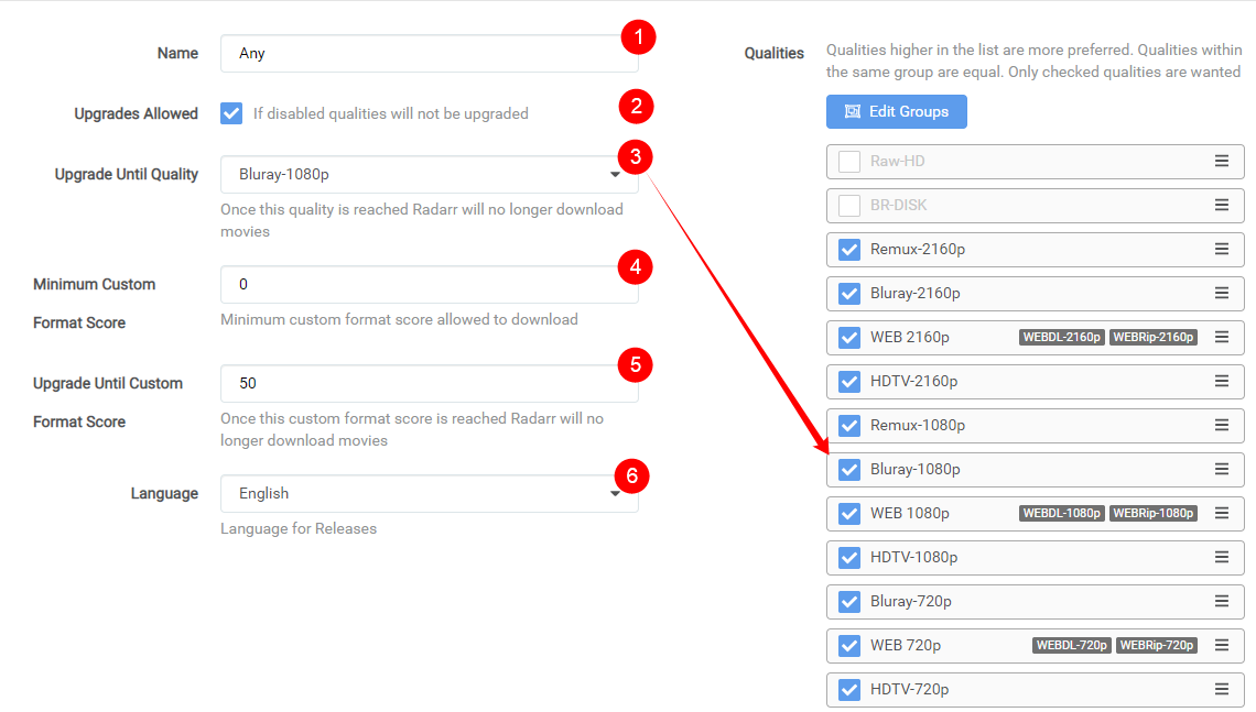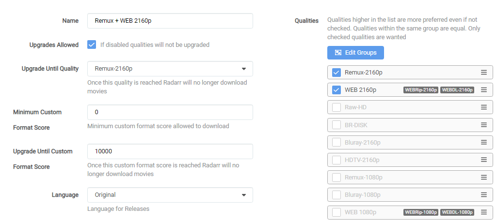 The following Quality Profiles can be combined into a single Quality Profile if you, for example, want to be able to upgrade from 1080p to 4K/2160p when and if it becomes available AFTER the 1080p release is made.