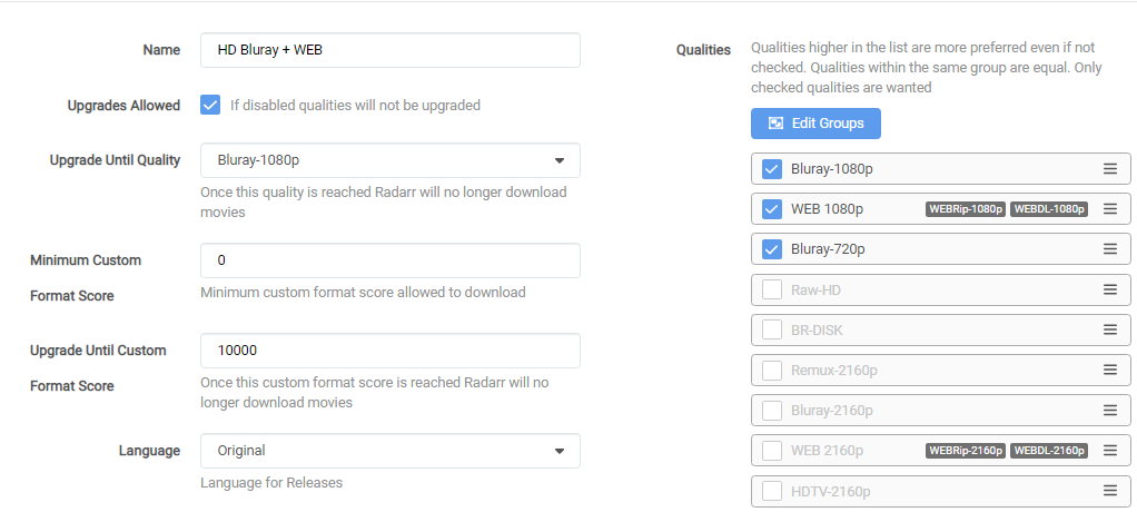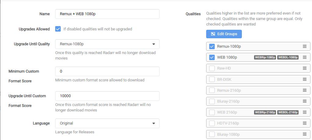 0means no upgrades will happen based on Custom Formats) - Your preferred language profile for your releases. (Original is recommended)